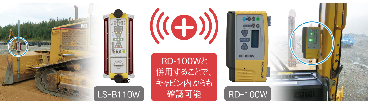 ブルドーザー/油圧ショベルに装着し「2Dマシンガイダンス」として使用することができます。リモートディスプレイ「RD-100W」と併用することでオペレーターの視認性は大きく向上、施工効率も向上します。
